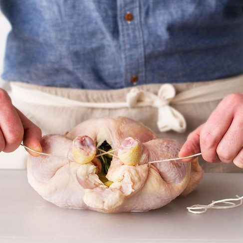 The whole chicken requires a lot of flavours to permeate all the meat. So use about one teaspoon of salt per pound of meat. Salt pulls moisture away from the surface, drying out the skin and helping it crisp up to perfection. We recommend using our Cornish Sea Salt Co. Sea Salt Crystals. Let the chicken rest for at least 30 minutes, or as long as 12 hours if you have the time.